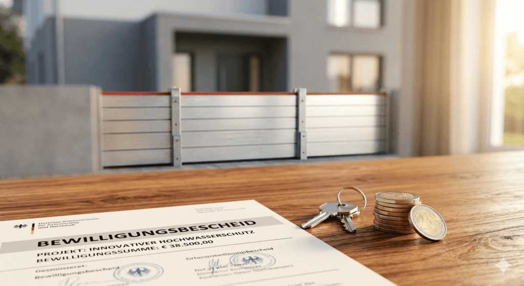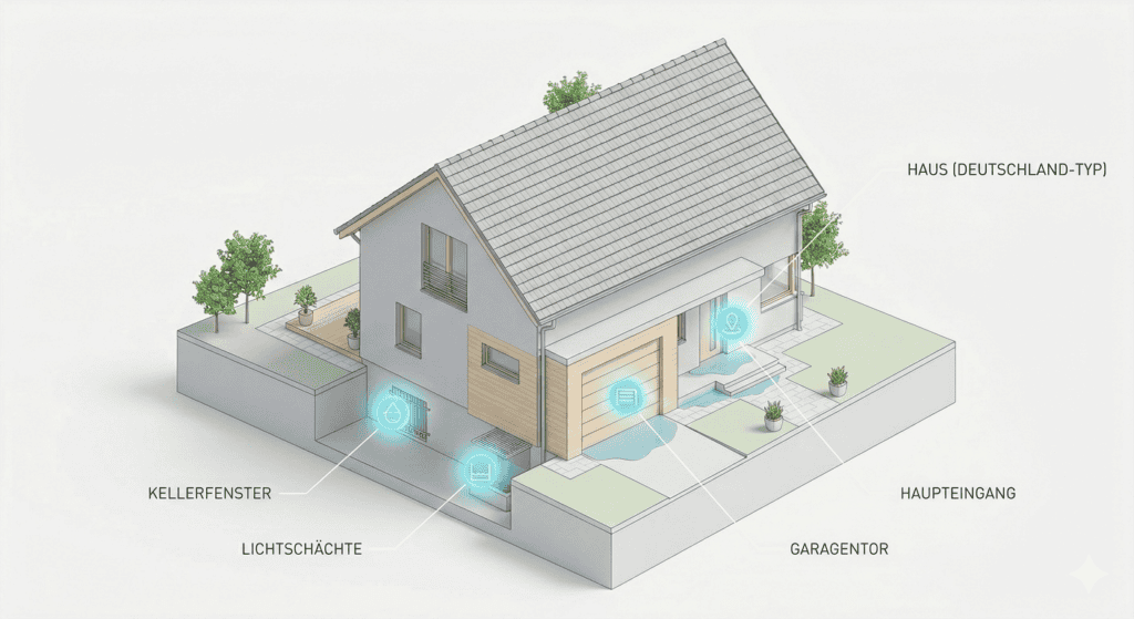 Detaillierte Übersicht zum Hochwasserschutz für Einfamilienhäuser 2026, inklusive Schutzmaßnahmen für Keller, Fenster und Garage.